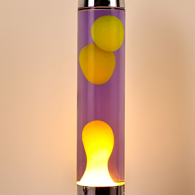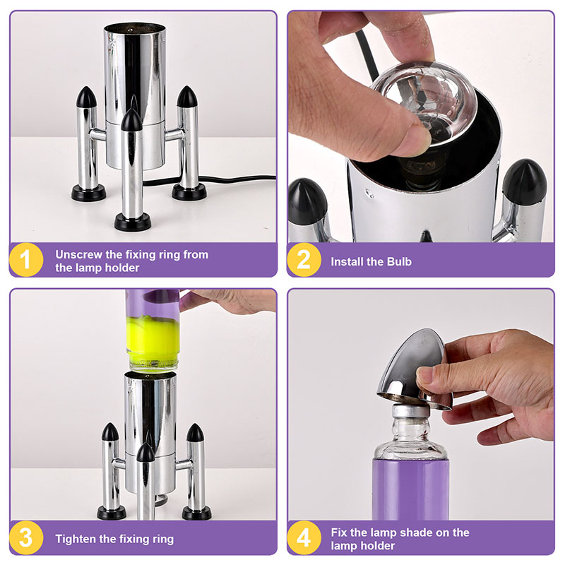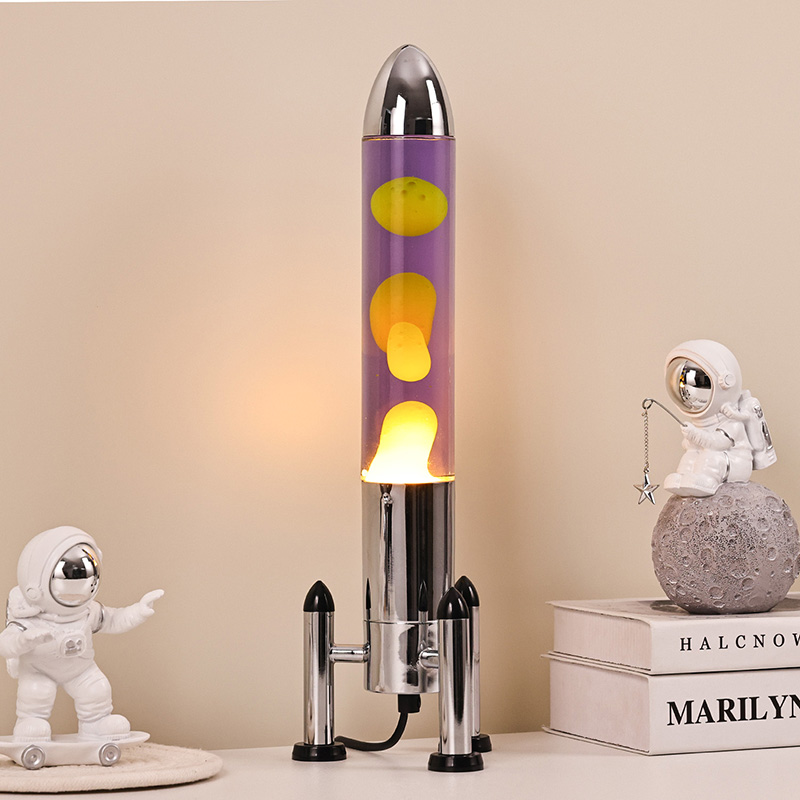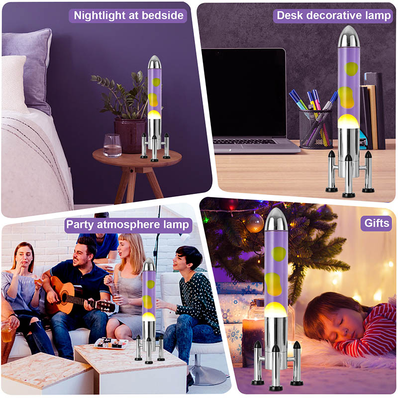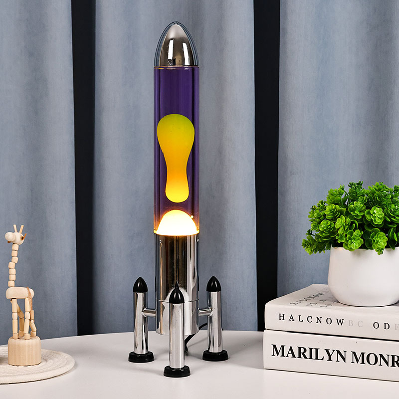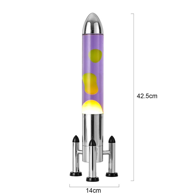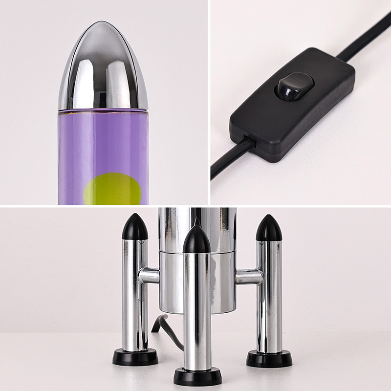 24VLampu Lava LED besar dengan lorek roket menampilkan reka bentuk berbentuk roket klasik, dengan cangkerang logam perak yang dipasangkan dengan badan botol kaca lutsinar, ringkas namun bergaya. Kuning terapung dalam cecair ungu di dalamnya