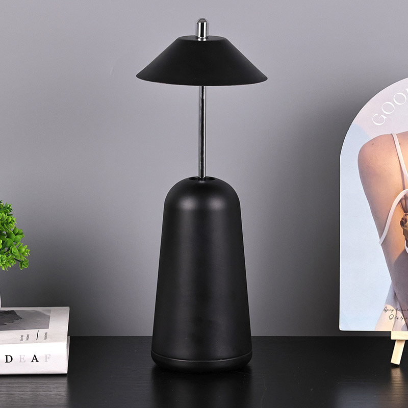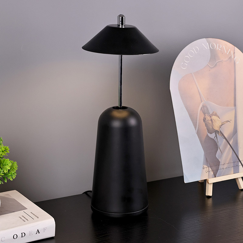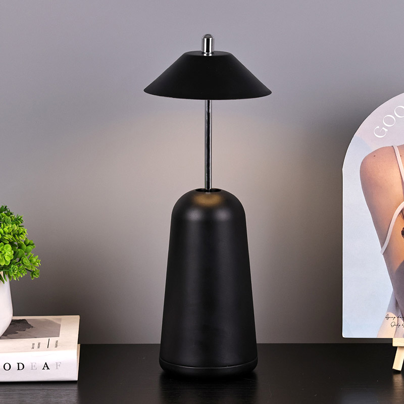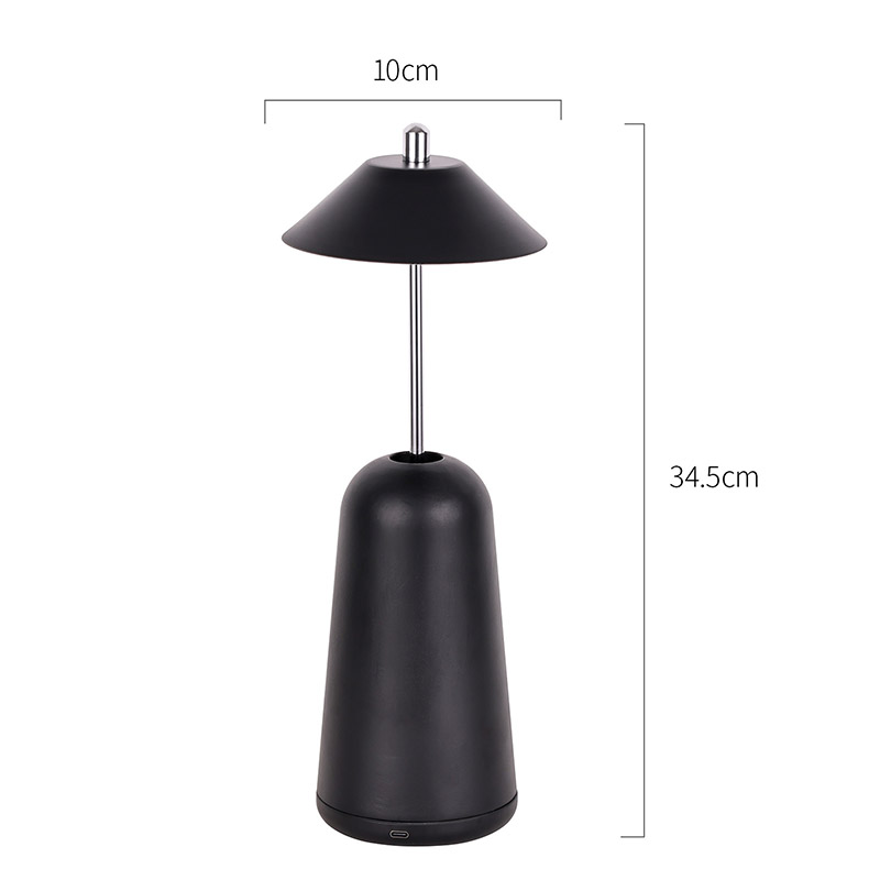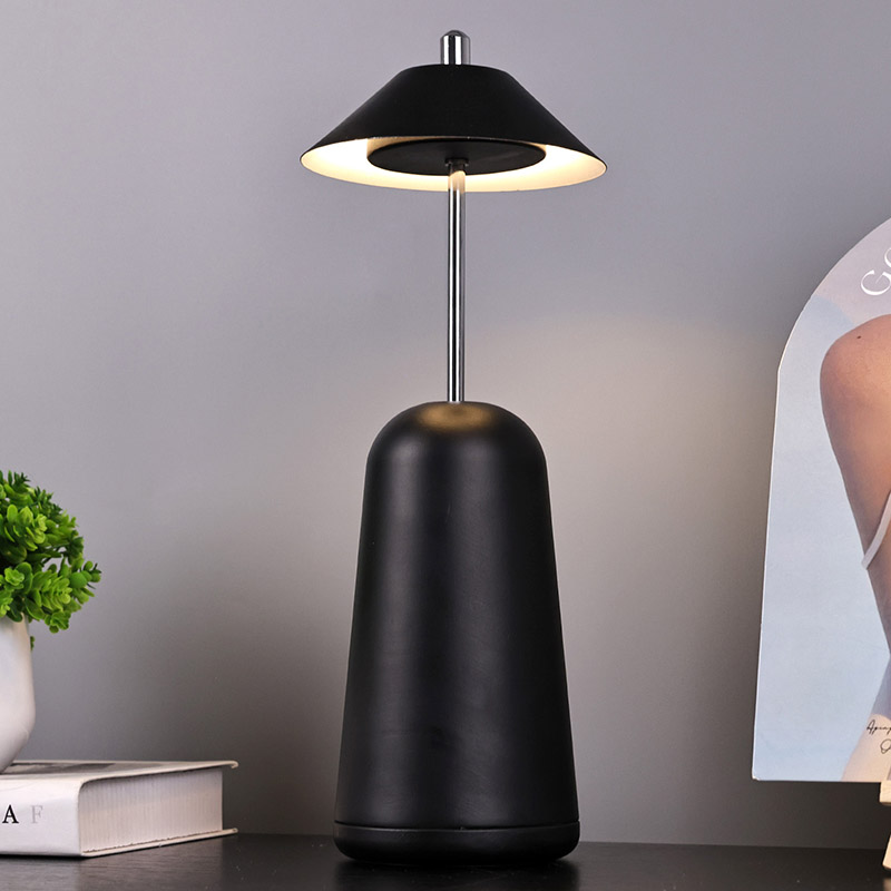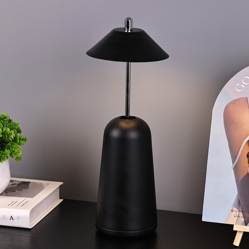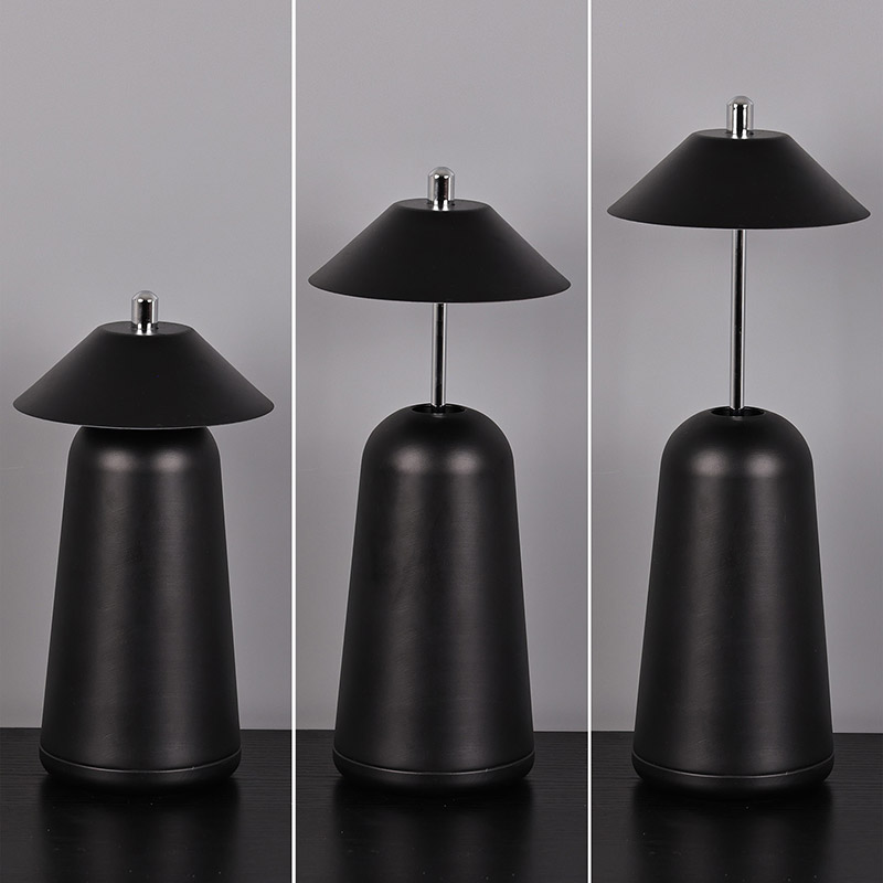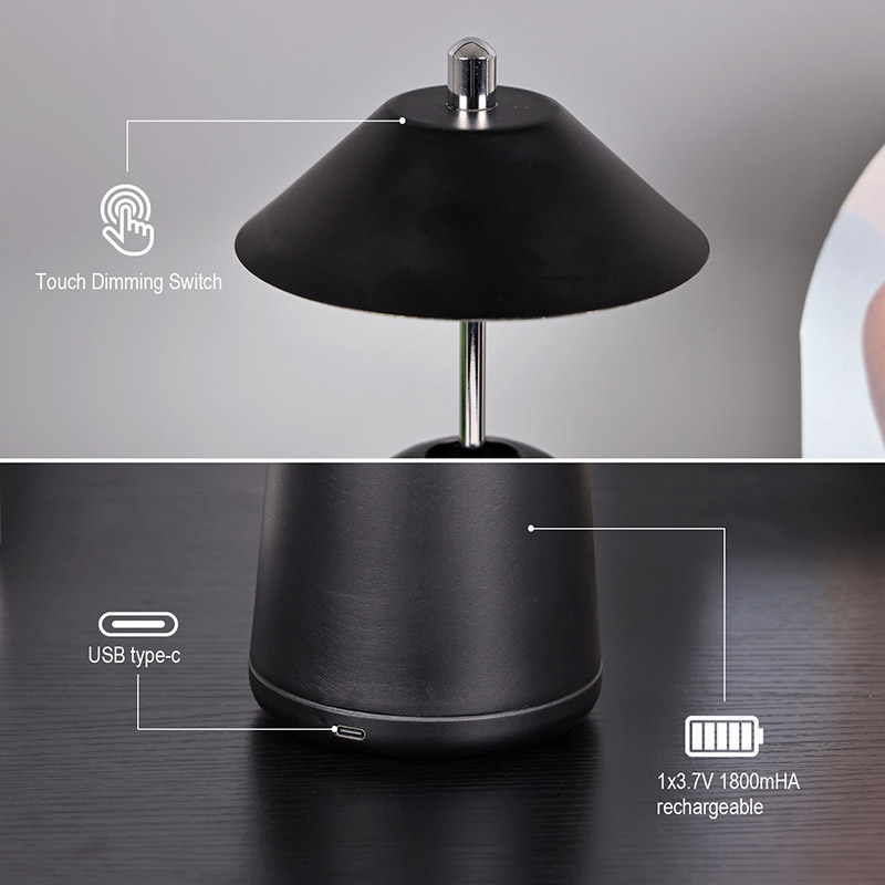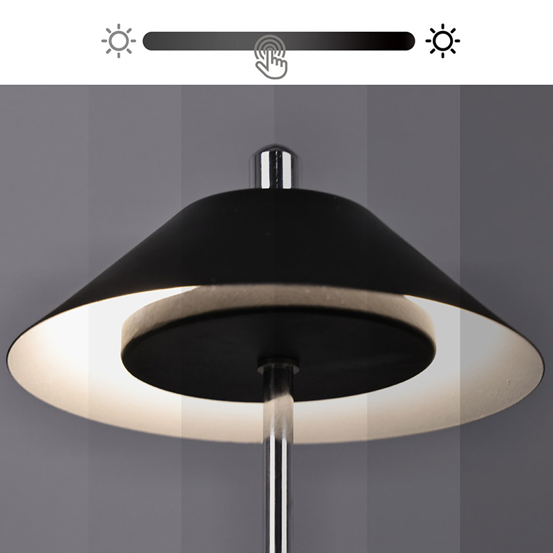 Cahaya Lampu Meja Led Moden dengan Adjust Hight Shade dipotong ke dalam tudung lampu secara dalaman, dengan warna hangat dan tiga tahap keamatan cahaya antara 3000K hingga 6500K. Bahagian atas tudung lampu ialah suis sentuh, serupa dengan antena. Tapaknya terdiri daripada logam silinder yang tidak sekata