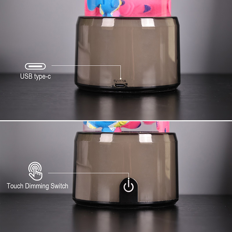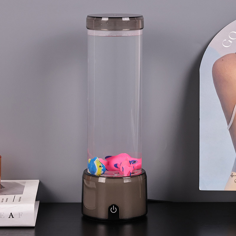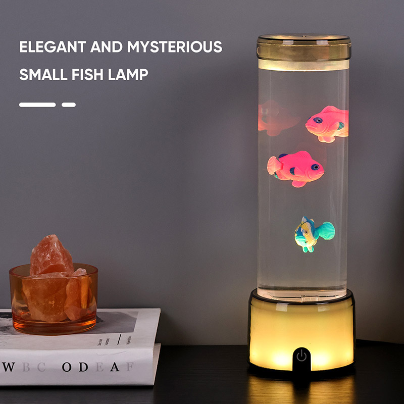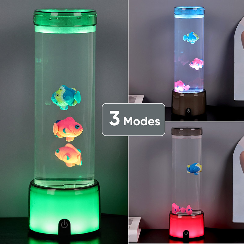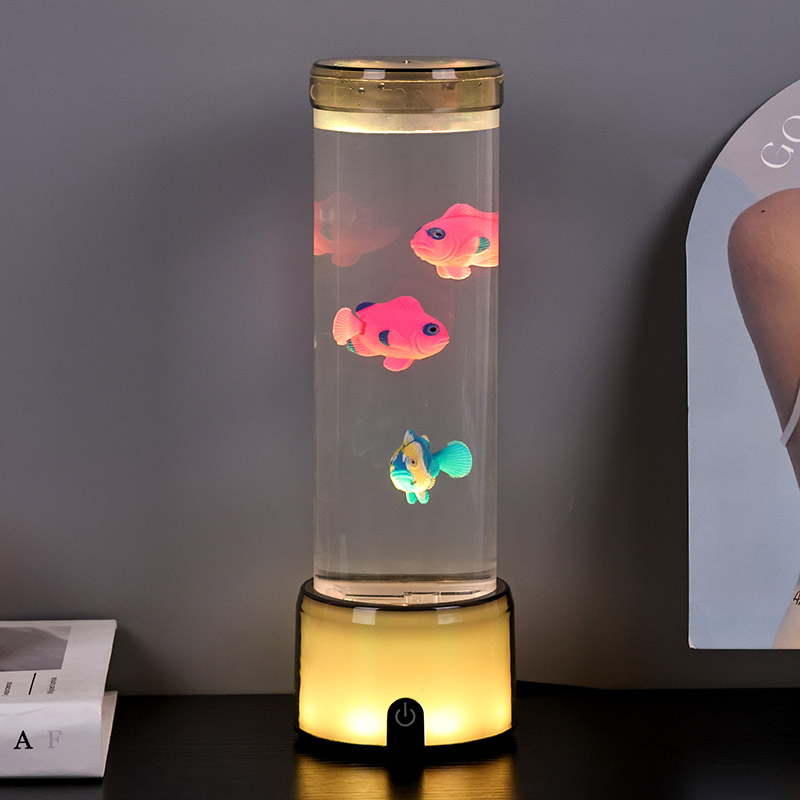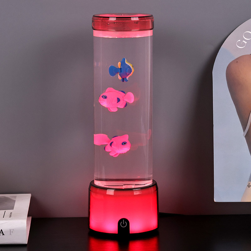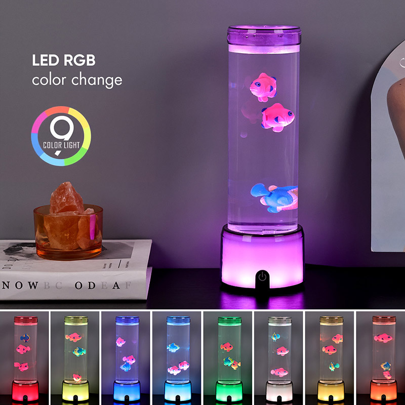 Tapak lampu ikan dilengkapi dengan asas lutsinar berubah warna RGB, yang boleh memancarkan pelbagai warna cahaya, menjadikan keseluruhan badan lampu memberikan kesan berwarna-warni. Warna selepas menghidupkan suis
