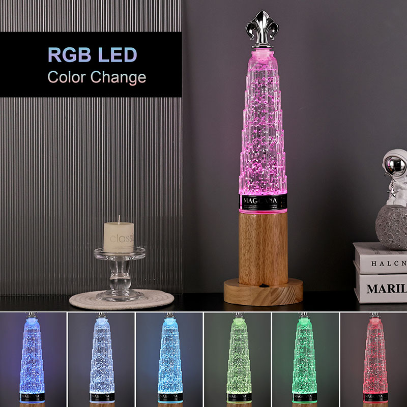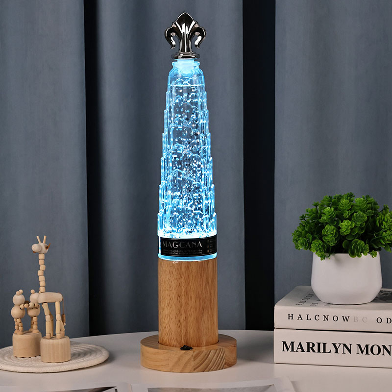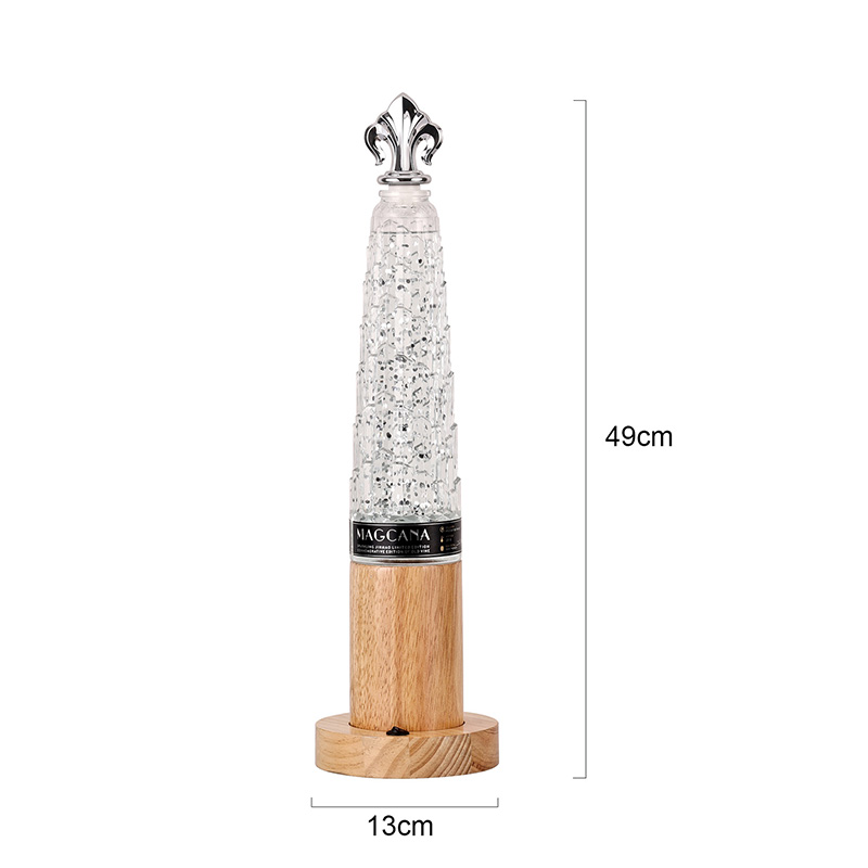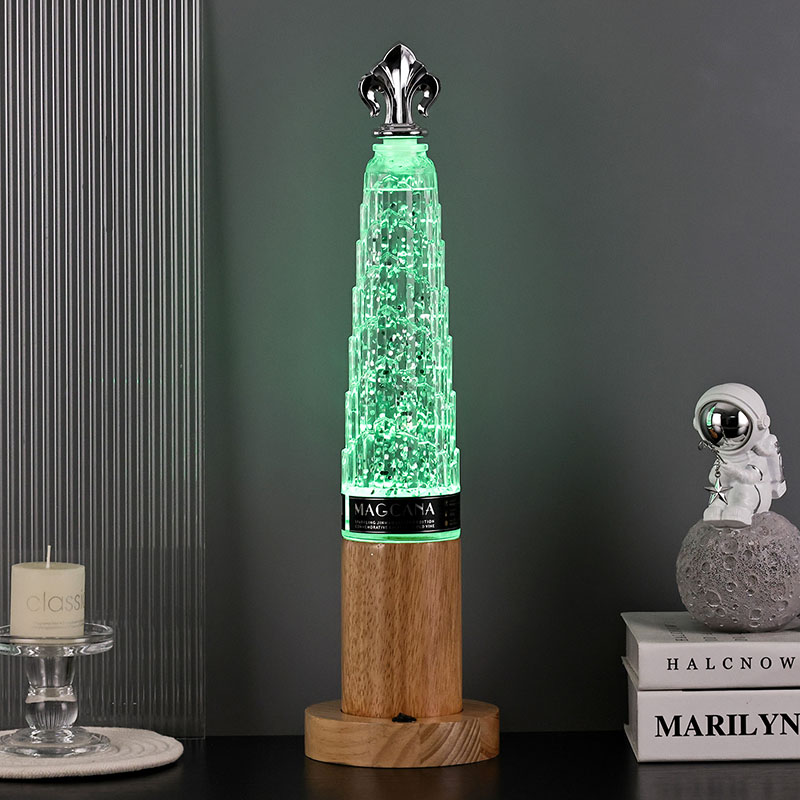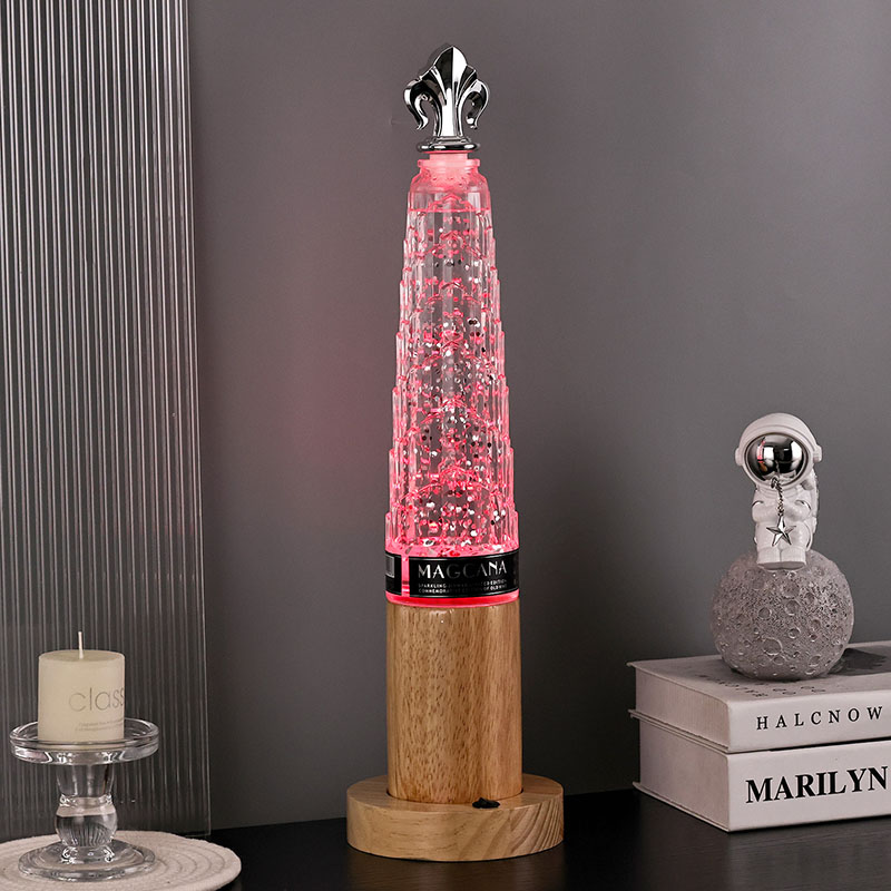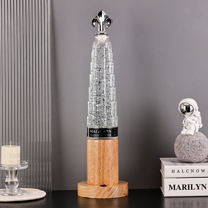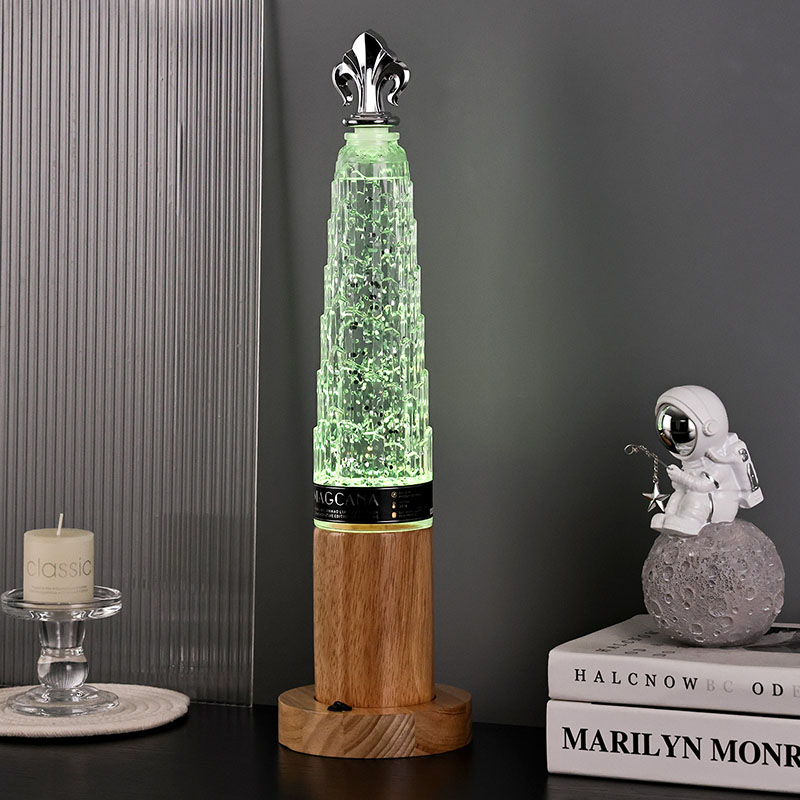 Lampu meja bergemerlapan teduh menara menggunakan reka bentuk berbentuk menara klasik, dengan hiasan logam yang indah tertanam di bahagian atas, ringkas namun mulia. Botol kaca lutsinar mengandungi cecair dan