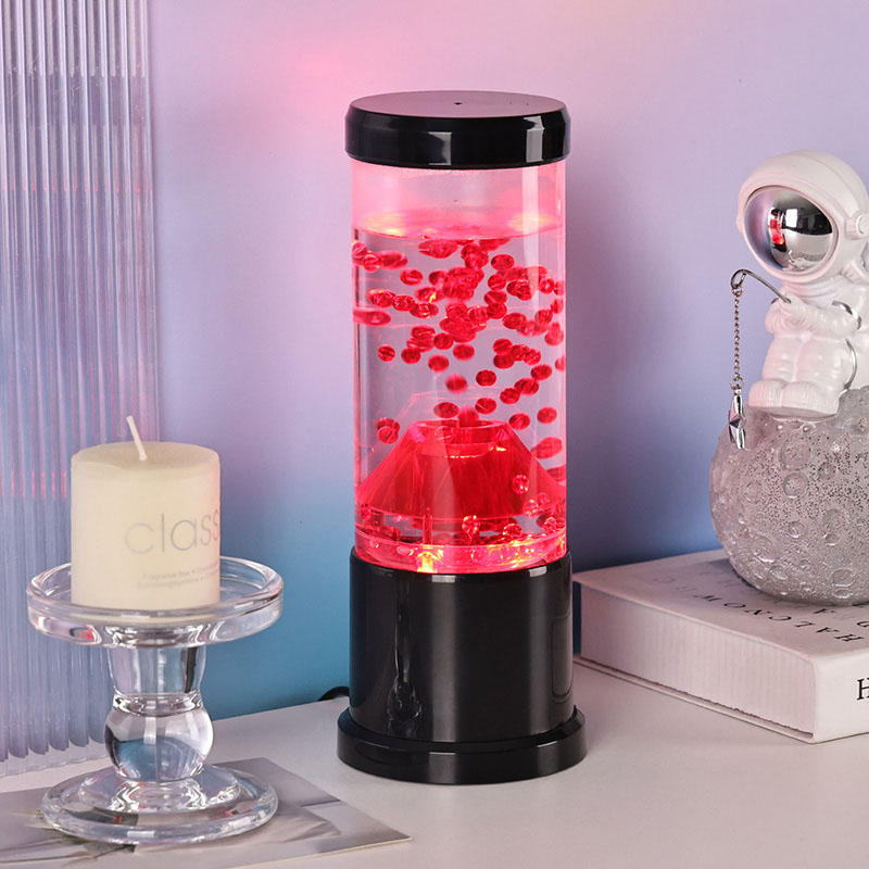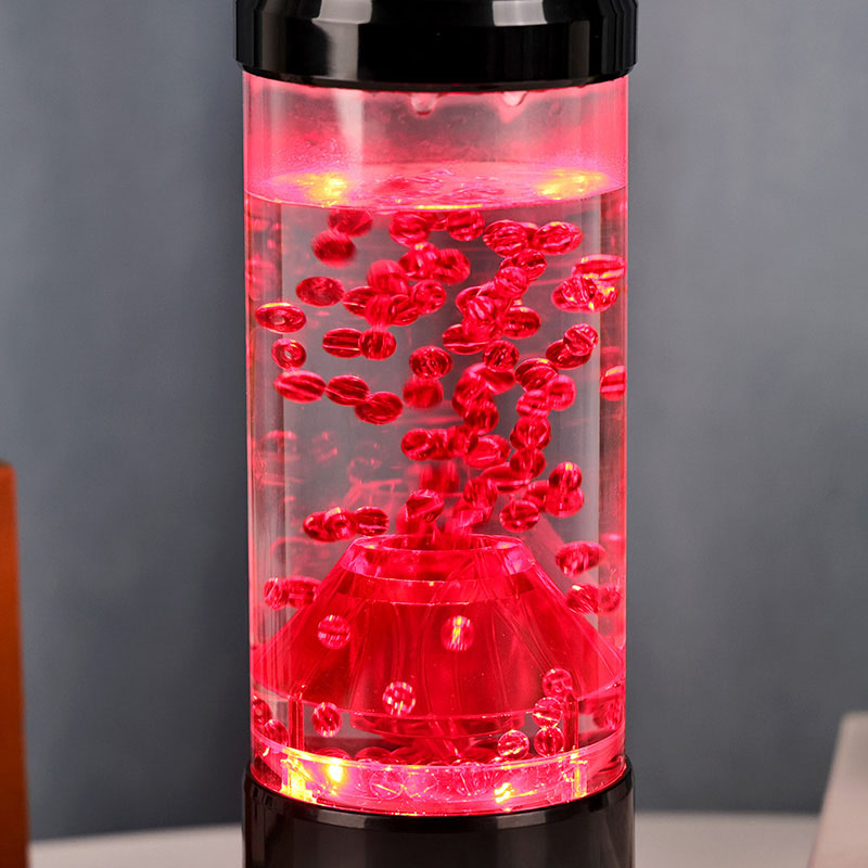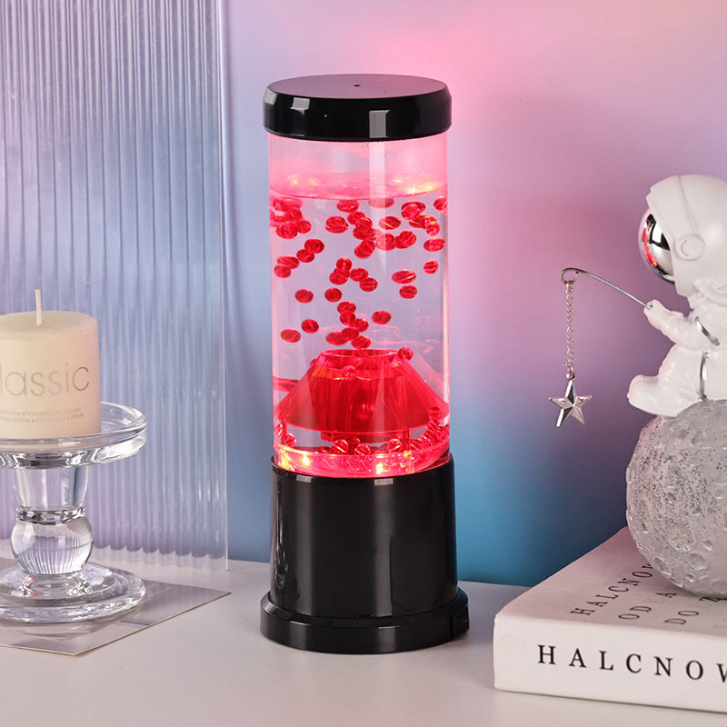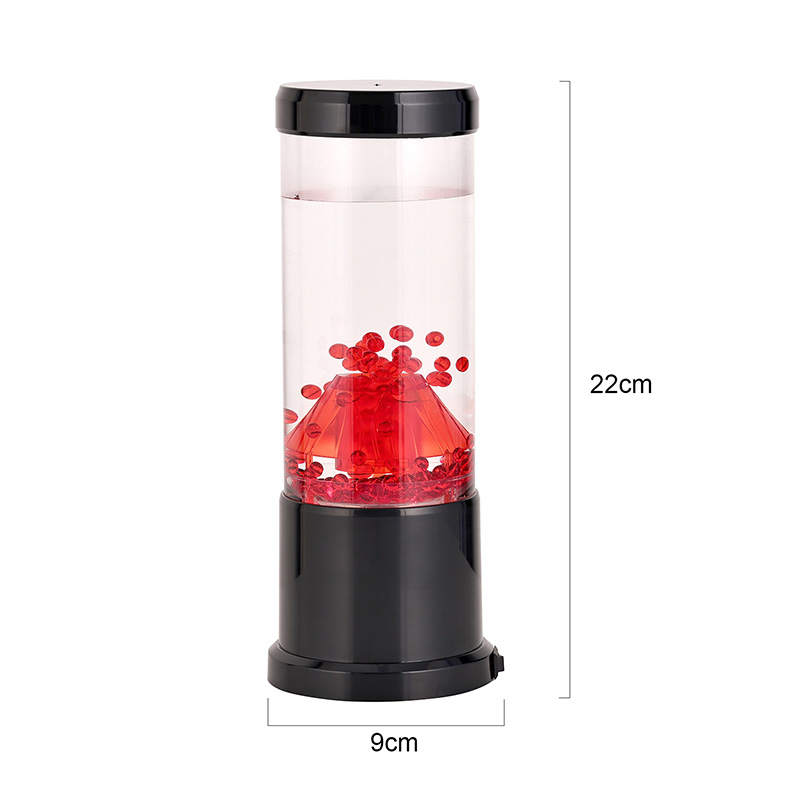 Bahagian tengah lampu malam ialah lajur lutsinar yang menyerupai kawah gunung berapi. Di dalam lajur ini, anda akan menemui paparan sfera merah yang bertenaga, mengingatkan lava cair yang mengalir di dalam kerak bumi. Sfera ini terapung dengan anggun dalam cecair jernih, menghasilkan kesan visual yang dinamik dan sentiasa berubah. Apabila cahaya memancar, ia memancarkan cahaya yang hangat dan menarik, sesuai untuk menetapkan suasana yang selesa di mana-mana bilik.